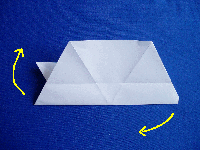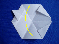 | 14.手前の紙を、折り目を活かして上に折り曲げます。(ピンクの線で谷折り) |