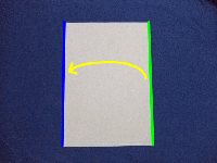 | 5.もう一度、両側の辺を中心に向かって折り曲げます。(緑の辺を青の線に合わせる) |