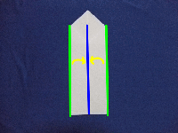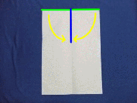 | 4.下半分の両側の辺を中心に向かって折り曲げます。(緑の辺を青の線に合わせる) |