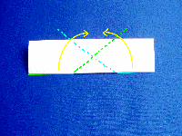 | 3.下の辺を見てだいたい3等分になるように左側は右斜め上に右側は左斜め上に折り上げます。(緑の実線を緑の点線に合わせるように折り水色の実線を水色の点線に合わせて折る) |