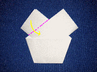 | 6.左上に出てる部分を、右側の斜めを生かして内側に折り曲げます。(ピンクの点線部分で谷折り) |