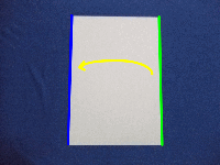 | 1.紙を縦置きにして横半分に折ります。(緑の辺を青の辺に合わせる) |