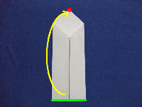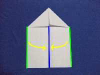 | 4.下側の両側の辺を中心に合わせるように折り曲げます。(緑の辺を青の線に合わせる) |