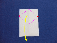 | 5.下の辺を上の三角の頂点に合わせるように手前から折り曲げます。 |
