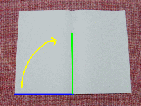 2.左下の辺を中心の折り目に合わせるように折り曲げます。(
