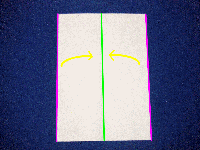 | 3.左右の辺を中心の線に向かって谷折りで折り曲げます。(左右のピンクの線を緑の線につける) |