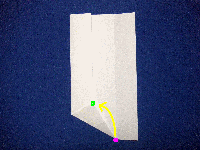 | 5.縦の折り目の線を左から1,2,3番とすると、3番の下端を押さえながら1番の下端を2番の線上につけるように折り曲げます。(ピンクの点線を谷折りするように左下の緑の点を中央の緑の点に合わせます) |