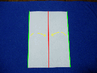 | 1.紙を縦置きにして一度半分に折り目をつけて、今度は中心に向かって両側を折りたたみます。(緑の辺を赤の線に合わせる) |