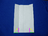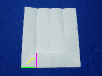 | 3.縦に4本線が出来ましたので外側の下の角を内側の線に向かって三角に折ります。(緑の辺をピンクの線に合わせる) |