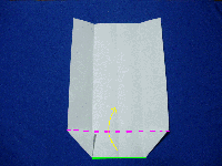 | 4.下の辺を両側の三角に折った線を谷折りに見て上に折り上げます。(緑の辺をピンクの線で谷折りにして上に折り上げる) |
